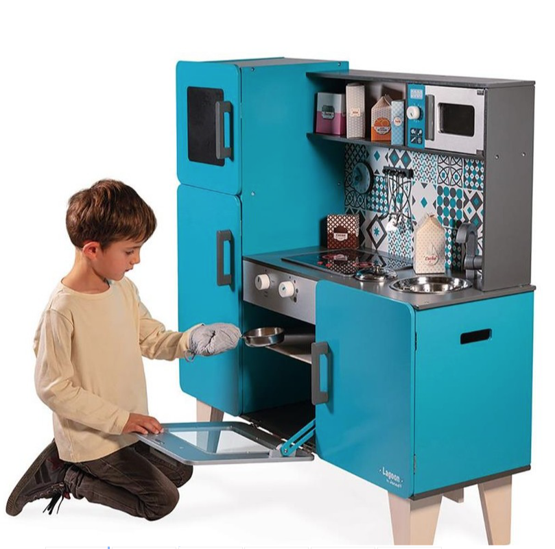 MAXI CUCINA LAGOON IN LEGNOche piacerà anche a “lui” che sogna di diventare chef. Questa magnifica cucina completamente equipaggiata comprende anche un forno, un forno a microonde, un armadietto e un frigorifero con ante magnetiche, 3 manopole con effetti sonori, un lavello in acciaio inox, un orologio e una lavagna. Altezza del piano di lavoro : 57 cm. Inoltre include: un attaccapanni, 3 utensili in metallo, 1 padella in metallo con coperchio, 1 colino, 1 guanto, un uovo al tegamino e 7 confezioni di alimenti in cartone (cacao, zucchero, succo d’arancia, pasta, formaggio, latte e riso). Dimensioni prodotto100 x 34 x 102,5 cm. PREZZO 199,00 €DETTAGLIO: Venduta già montata, come una vera cucina, è dotata di piastra a induzione a LED: basta premere una volta i pulsanti rossi per accenderla e una seconda volta per ascoltare il suono dell’acqua che bolle. Il suono e la piastra a induzione si spengono automaticamente dopo 30 secondi o premendo una terza volta i pulsanti rossi.