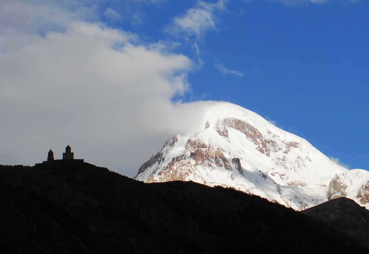 Il villaggio di Kazbegi (1.750 m), situato in posizione spettacolare a pochi chilometri a sud del confine con la Russia, è dominato a ovest dalla cima innevata del Monte Kazbek (5.047 m), su cui si staglia la sagoma inconfondibile della chiesa di Tsminda Sameba, Kazbegi è la più importante città del Khevi, la regione a nord del Passo di Jvari.
