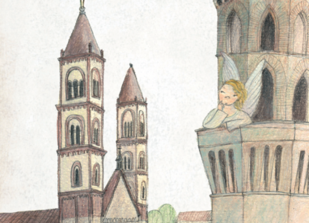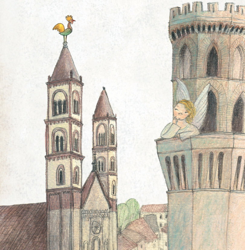 «Chicchirichì!» gridava a squarciagola Andreino, tutto contento di quello che aveva fatto, guardandosi intorno come sbattuto dal vento. Non si accorse, però, che stavano arrivando l’Angelo della torre e il suo grosso amico Biciulan. L’angelo, sbattendo le sue ali azzurre e luminose, volava veloce nel cielo, mentre il biscotto, con le sue lunghe gambe, lo seguiva correndo.