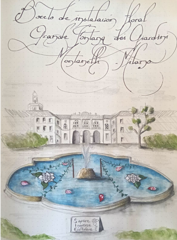 La fontana si presenterà all’appuntamento dell’8 maggio secondo il prospetto statico a opera dell’artista Pablo Ruben Masci, artista italo-argentino che collabora stabilmente con Infioritalia. In seguito altri tappeti floreali prenderanno forma all’interno della vasca: come petali di camelia, giganti e piccoli, fluttueranno sull’acqua. Verranno creati in laboratori per il pubblico. Ancora il pannello verticale (max 1,35x 2,70 m) decorerà la fontana, posto a terra, rendendola un simbolo di rinascita bellezza e cooperazione, che invita al Sapere Insieme Coltivare: SIC. Lì saranno collegati i fili sospesi con i nostri sogni.