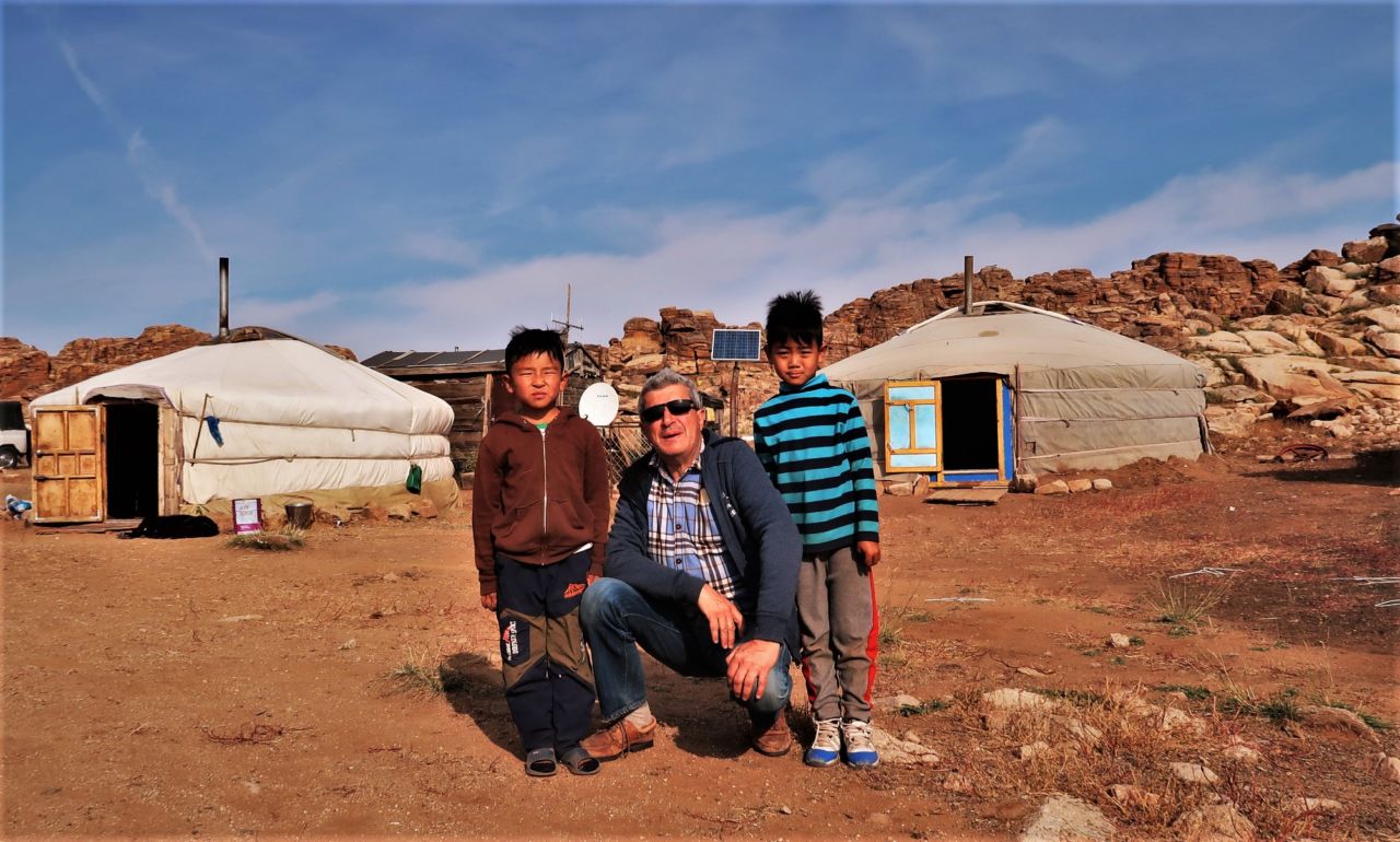 passato. Interessante pure la visita del piccolo museo storico, sui popoli Unni, Turchi e Mongoli! La distruzione della capitale da parte delle truppe Manciu dopo la caduta della dinastia mongola, non aveva lasciato nessuna traccia: una “delenda Cartago” asiatica. Al ritorno a Ulan Bator ero partito con Bagart, l’autista che mi avrebbe accompagnato per i successivi quattro giorni di full immersion nella steppa. Rifornimento di cibarie e bombole gas e ci eravamo diretti al National Park di Khustayn luogo di reintroduzione dei cavalli selvaggi di razza originaria mongola. Ero riuscito ad avvicinarli su per una collina e mi aveva coinvolto sentire i richiami dei cervi dai boschi contigui. Cosi come la visita nel mezzo del nulla di un sito di sepoltura degli aristocratici delle tribù turciche che nel VI secolo dominavano la regione. Per la notte trovavamo ospitalità presso famiglie nomadi. La prima ci aveva accolto con una ciotola di latte crudo, che per senso di rispetto avevo accettata. Ne avrei pagato le conseguenze nella nottata! Quando mi avevano mostrato a qualche centinaia di metri, la baracca costruita intorno a un buco per le necessita corporali, avevo sperato di non doverla utilizzare, e invece era stata una notte di passione con frequenti visite mentre i cani abbaiavano come folli. La mattina dopo i padroni a mie domande sul perhe dicevanoo wolfs! I giorni successivi erano apssati in una trance di stupore, in giro tra spazi immensi, branchi di animali selvaggi e ogni tanto gruppi di ger. Molto bello un lago alla base di una montagna con paesaggi lunari e branchi di cavalli che correvano bradi. Il punto più a sud lo avevamo raggiungo ai margini del deserto dei Gobi dove iniziavano le dune e all’orizzonte si ergevano montagne in un clima secco tipo Yemen. Per pranzo scaldavamo un po di acqua e mangiavano noodle liofilizzati comunicando a livello basilare, perché l’autista non parlava inglese; mi restava più tempo per riflettere e per disintossicarmi di emozioni negative. L’ultimo giorno al Terelj, durante un’escursione a cavallo avevo ammirato i colori meravigliosi dell’autunno nella taiga. Ora qui a Ulan Bator il tempo è cambiato e siamo a meno nove. Domani, faro una visita alla locale sede di “SOS village children” nel quadra della mia raccolta fondi e poi partenza per la Cina con tanti dubbi sulla lingua, biglietti dei treni, dove dormire. ATM, internet. Insomma il sale dell’avventura. Voi non dimenticate però di contribuire alla raccolta fondi e di condividere la pagina FB!