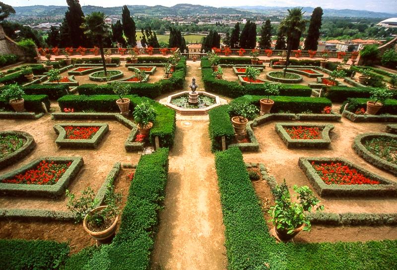 Villa Caprile a Pesaro ha splendidi giardini di delizie che seguono il pendio del colle, su tre terrazzi collegati da scalinate. Il primo ospita giochi d’acqua che sorprendono i visitatori con spruzzi da siepi e vasi monumentali; il secondo livello è occupato dal pomario con le sue piante da frutto; il terzo ospita il viridarium, con le profumate essenze di rosmarino, salvia, ginepro e timo. La settecentesca Villa Caprile ed il suo parco di circa 25 ettari si affacciano sulla città dal Monte San Bartolo, all’interno dell’omonimo Parco che custodisce, oltre a questa storica residenza, anche altre ville di grande bellezza, come la cinquecentesca e vicinissima Villa Imperiale.