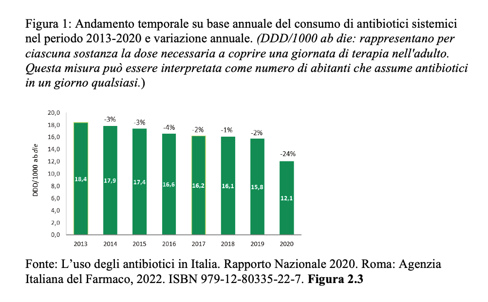- Osservatorio Nazionale sull’impiego dei Medicinali. L’uso degli antibiotici in Italia. Rapporto Nazionale 2020. Roma: Agenzia Italiana del Farmaco, 2022. ISBN 979‐12‐80335‐22‐7. Il Rapporto è disponibile consultando il sito web: aifa.gov.it. https://www.aifa.gov.it/documents/20142/1664282/Rapporto_Antibiotici_2020.pdf