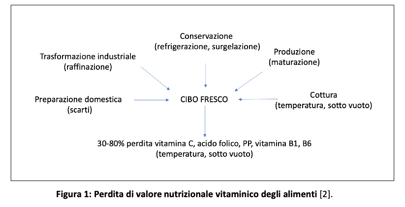 Una dieta sana, varia e ricca di cibi freschi è la strategia più importante per non incorrere in uno stato di malnutrizione. Sappiamo, infatti, che molte lavorazioni a cui sottoponiamo gli alimenti contribuiscono alla perdita di micronutrienti essenziali poco stabili, come le vitamine (Fig.1).