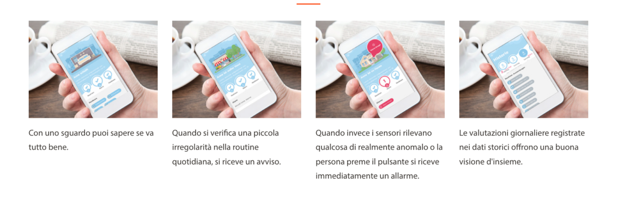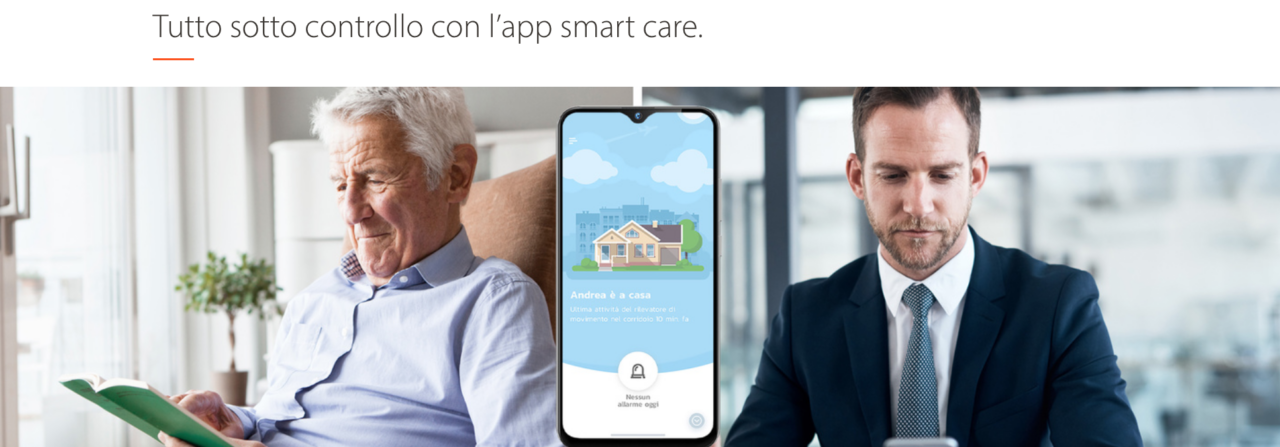 Tramite l’App Smart Care si individuano le abitudini dei propri cari, ad esempio l’orario di alzata mattutina, o l’uscita per la passeggiata al solito orario, e se il sistema registra un’irregolarità nella vita di tutti i giorni, quindi, ad esempio, il nostro caro non si è svegliato all’orario d’abitudine oppure il sensore porta non ha registrato la chiusura della porta per la passeggiata abituale, informerà immediatamente con una notifica push, o in caso di emergenza, con una telefonata.