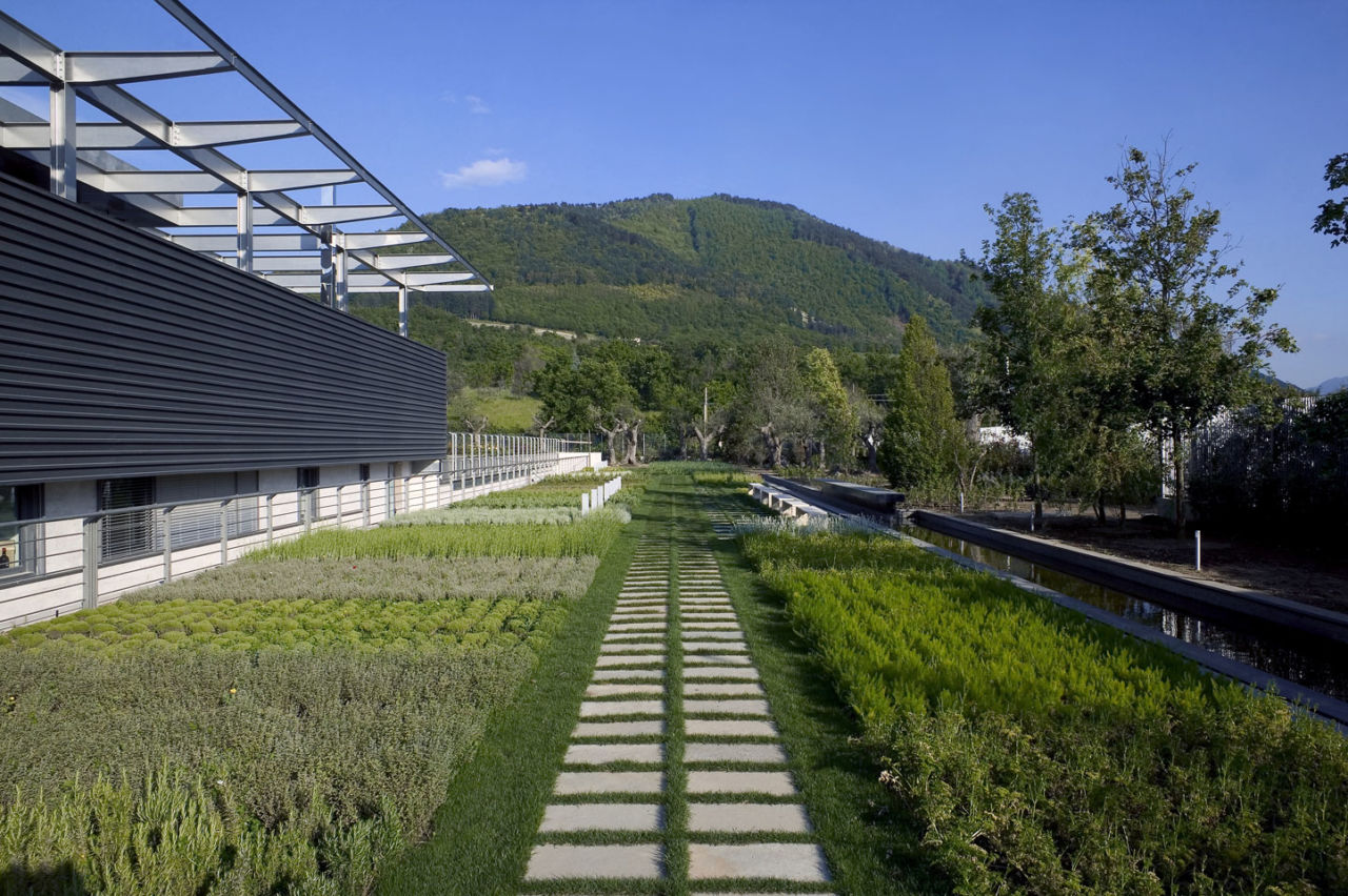 Anche questa parte della struttura (progetto firmato dall’architetto giapponese Hikaru Mori) è sostenibile a 360 gradi: i vini sono coltivati al 100% in biologico, in tre anni le erbe spontanee sono cresciute da 40 varietà alle oltre 130 attuali; il fabbisogno energetico viene interamente autoprodotto grazie a pannelli fotovoltaici.
