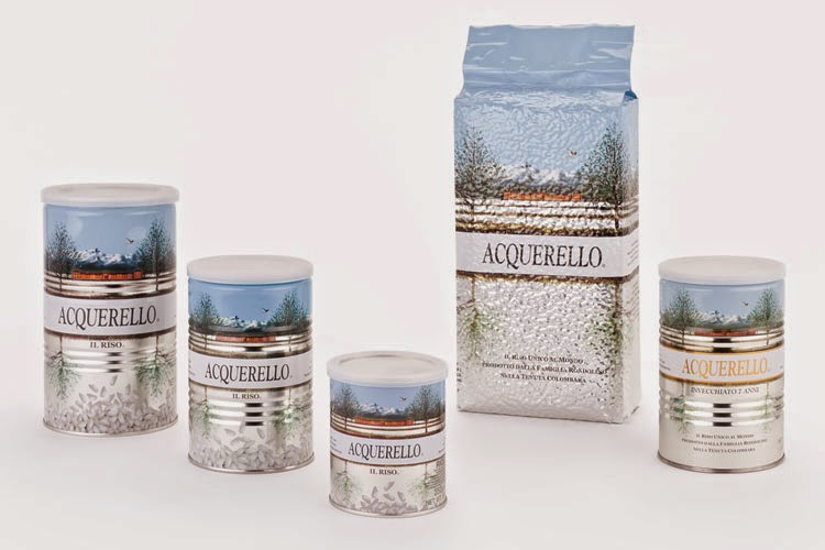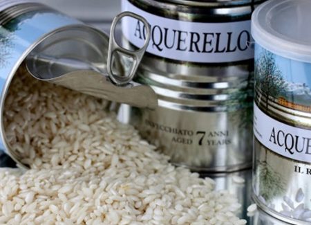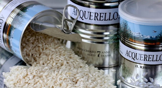 La seconda scelta è stata ancor più di diversità: l’invecchiamento del risone almeno un anno prima di trasformarlo in riso bianco, secondo il detto popolare “riso vecchio lavorato fresco”, ma per conservarlo bene utilizza la tecnica della refrigerazione. La terza scelta è stata di innovazione: confezionare il riso sottovuoto nel contenitore più affidabile la lattina, per ottenere due risultati, una perfetta conservazione nel tempo e una identificazione esclusiva differenziandone l’immagine. La quarta scelta è stata il nome Acquerello. La coltivazione del riso è l’unica che viene fatta in sommersione; governare l’acqua, che è la vita del riso, è il lavoro più difficile e importante per la sua crescita. Da questa cura è nata l’idea del nome.