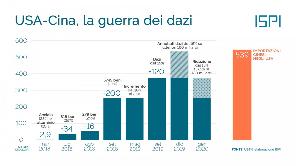 L’intesa segna una svolta nelle relazioni commerciali sino-americane e sospende una pericolosa spirale, che avrebbe portato praticamente tutto l’import americano di prodotti cinesi (pari a 539 miliardi nel 2018) ad essere oggetto di misure tariffarie. Sul testo definitivo – diffuso dalla Casa Bianca – Pechino si impegna comprare 200 miliardi di dollari di beni americani tra il 2020 e il 2021. Di questi 75 miliardi di beni industriali; 50 miliardi di prodotti energetici, 40 di prodotti agricoli e 35-40 in servizi. In cambio Washington sospende ulteriori 160 miliardi di dazi e a riduce le tariffe introdotte a settembre su 120 miliardi di dollari di prodotti importati dalla Cina, dal 15% al 7,5%. Ma lascia inalterati i precedenti dazi del 25% su 250 miliardi di beni. Pechino, inoltre, si impegna a non fare svalutazioni competitive e a migliorare l’accesso al proprio mercato alle imprese di servizi finanziari americani. Due giorni fa, in cambio, gli Stati Uniti hanno depennato la Cina dalla lista dei “manipolatori valutari”, per la svalutazione dello yuan nei confronti del dollaro dello scorso anno.