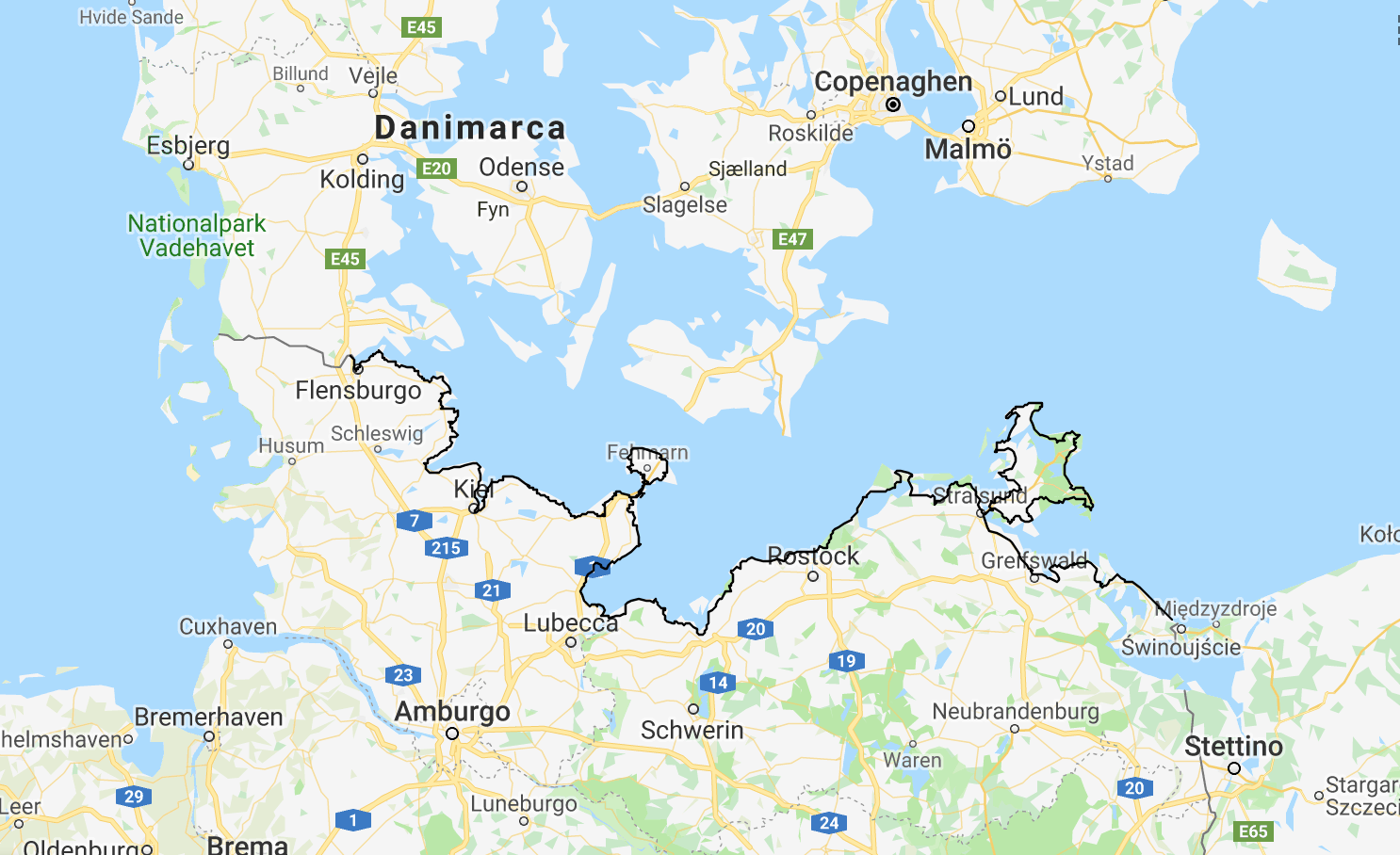 Dopo 150 km si raggiunge la città di Kiel, la più popolosa del Land dello Schleswig-Holstein. Dagli 85 metri della Torre memoriale si gode di una vista panoramica sulla strada fatta e su ciò che segue; anche il Museo Marittimo della città è interessante. Kiel è in fondo a un grosso fiordo, per cui usciti dalla città ci si dirige nuovamente verso nord. Per i successivi 25 km si pedala letteralmente lungo la costa, a pochi metri dalla spiaggia. Si continua attraversando numerosi villaggi, fra i quali degno di nota è soprattutto Oldenburg (218 km dalla partenza) con il suo centro storico. Superata Heilegenhafen (233 km), il percorso porta ad attraversare un ponte per compiere un giro dell’isola di Fehmarn, di notevole interesse per gli appassionati di birdwatching in quanto è qui che molte specie di uccelli migratori si fermano per riposarsi lungo i loro viaggi. Se si decide di non visitare l’isola, si risparmiano un’ottantina di km.