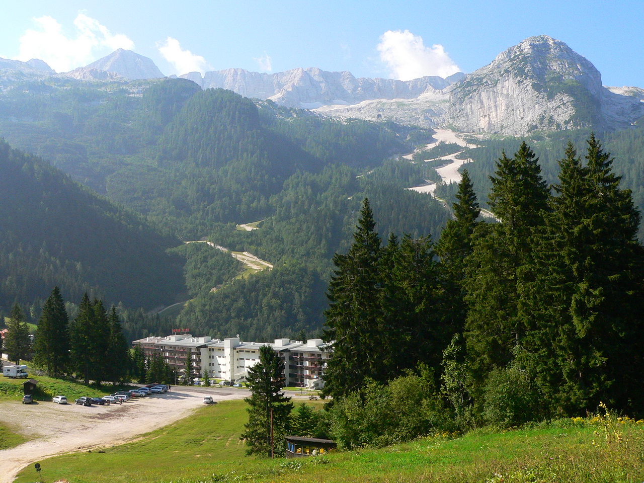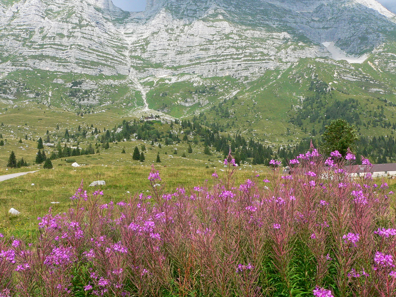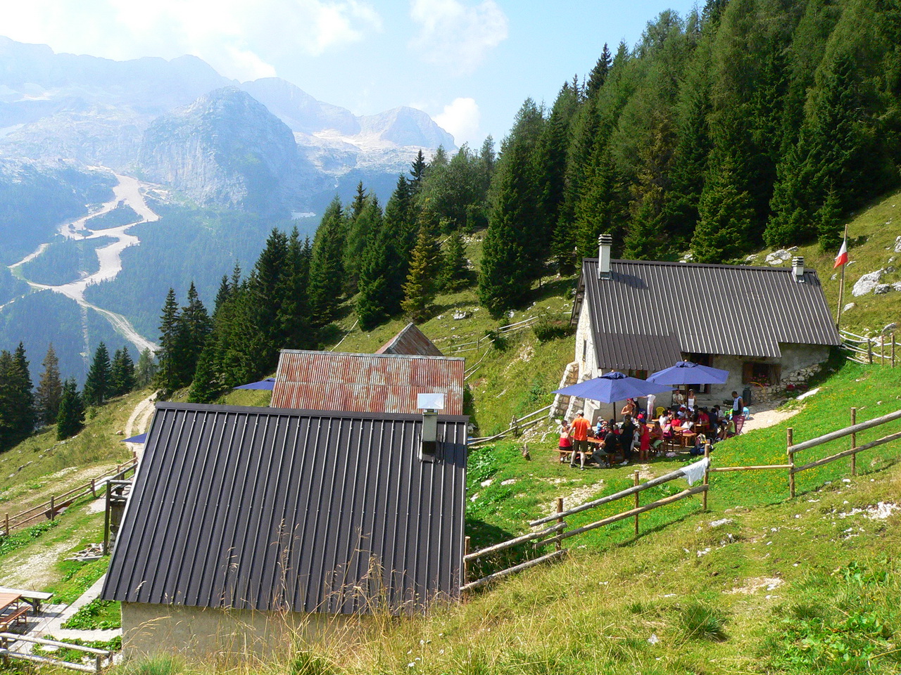 Dalle casere imbocchiamo la strada di servizio in direzione ovest che coincide ora con il segnavia CAI n.624. Il percorso prosegue lungo il bosco seguendo l’ orografia della montagna fino a raggiungere i pascoli erbosi di casera Larice (m. 1479). Poco prima della casera troviamo anche un tavolo con panche per una breve sosta. (Guarda la foto). Proseguiamo lungo la strada che prosegue oltre la casera su un pianoro, sempre più aperto fino a raggiungere, prima dei rifugi della prima Guerra Mondiale e poi la casere Parte di Mezzo (m 1552) situata al centro dei Piani del Montasio (nel recinto della casera troviamo l’unica fontanella funzionante e ne approfittiamo per riempire le borracce ormai vuote). Il panorama ora può spaziare su tutta la dorsale montuosa del Canin, dal monte Robon al Sart, mentre alle spalle della casera abbiamo una visuale pressoché completa delle vette comprese tra lo Jof di Montasio ed il Modeon del Buinz.