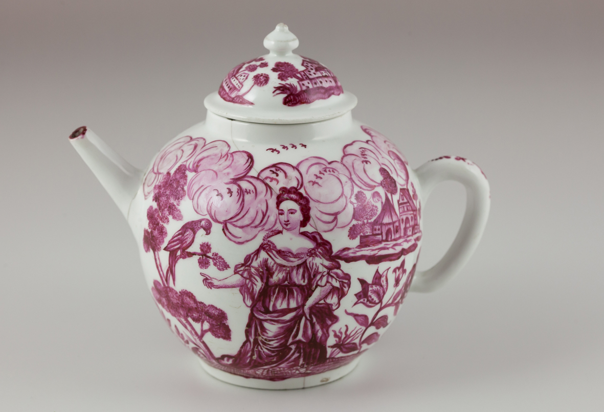 In apertura: Teiera con gentildonne entro paesaggio continuo con nuvole e architetture a monocromo porpora. Venezia, Manifattura Vezzi (decoro attribuibile dubitativamente a Ludovico Ortolani), 1720-1724. Foto Kajetan Kravos.