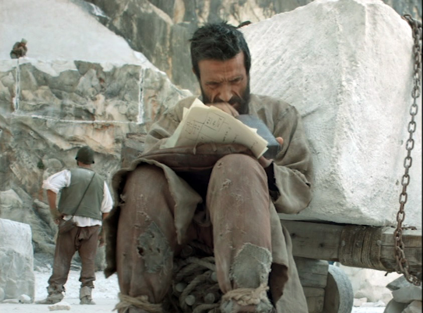 Uno stacco seguito da due dissolvenze (in chiusura e in apertura) ci porta finalmente al XVI secolo e al lavoro dei cavatori di marmo sulle Alpi Apuane.