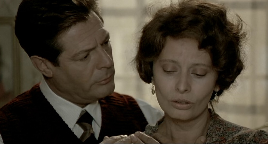 Ma che cosa ci racconta Ettore Scola di questa giornata? Ci racconta una (anzi due) condizioni di vita esemplari. Due stati d’animo, due esistenze apparentemente lontanissime eppure sin troppo vicine nella profondità dei significati reconditi. Le due esistenze sono incarnate da Antonietta (Sofia Loren), madre di sei figli, moglie di un piccolo funzionario pubblico assertivamente fascista e fascista anch’essa o, per lo meno educata e cresciuta nel mito dell’uomo forte di cui ha una percezione quasi mitica se non mistica, e Gabriele (Marcello Mastroianni), speaker radiofonico dell’Eiar (non ancora Rai) in aspettativa. I due sono di fatto degli emarginati, dei perdenti secondo i canoni dell’epoca. L’una relegata al ruolo di “serva domestica” a disposizione di marito e figli in un ruolo ancillare falsamente nobilitato dalla comprovata fertilità, l’altro in attesa di essere confinato in una località sperduta per il solo fatto di essere omosessuale ossia portatore di una “diversità” invisa al regime. E i dialoghi ricordano giustamente come le politiche familiari del fascismo prevedessero un premio in denaro alla nascita del settimo rampollo (dietro il presupposto che i cittadini dessero “figli alla patria”) mentre oltre una certa soglia di età (25 anni) gli scapoli erano tenuti a versare la cosiddetta “tassa sul celibato”.