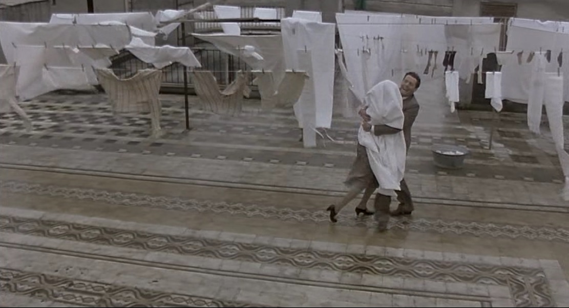 Ma sono molto numerosi i dettagli che nel corso della vicenda portano luce sui significati dell’ideologia fascista e sull’emarginazione che condiziona le vite di chi non si conforma ai dettami dell’opinione comune. Uno per tutti: l’album di Antonietta con i ritagli, le fotografie, gli slogan che appartengono alla mitologia del regime e alle sue parole d’ordine in cui si traducono le politiche sociali. Come dicevamo all’inizio il film si apre con materiale di repertorio cinematografico, ma anche l’intero corso delle vicende di Antonietta e Gabriele è contrappuntato in colonna sonora dalla radiocronaca della visita di stato trasmessa tutto volume dalla radio della portinaia del palazzo. Va detto che negli archivi Rai non esiste la registrazione reale di quell’evento per cui gli autori del film sono dovuti ricorrere al parlato dei cinegiornali Luce che erano invece stati conservati. Manipolandolo abilmente per adattarlo, come sfondo sonoro, alle diverse situazioni drammaturgiche escogitate nello sviluppo della trama. Con il commento pronunciato da Guido Notari, speaker ufficiale dell’Istituto Luce, dalla voce stentorea, inconfondibile, autentico “megafono del regime” che a volte arriva in primo piano, sovrasta il resto dei rumori, introduce o dà lo spunto a battute dei dialoghi oppure, in altri casi, come nelle scene ambientate negli stenditoi sul tetto del palazzo viene relegata a puro brusio indistinto, rumore di fondo di cui si coglie solo la retorica marzialità e i toni trionfalistici.