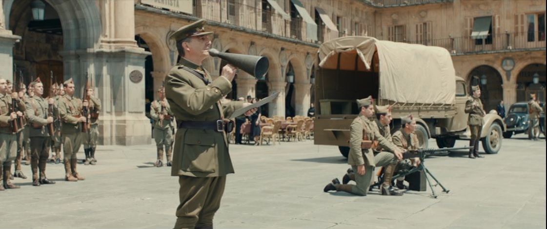 Vediamo di riassumere brevemente il contesto in cui si colloca il film che prende inizio il 19 luglio 1936 con la sollevazione dell’esercito contro le istituzioni repubblicane democraticamente elette. Nella storia della Spagna del ‘900 c’era già stata una dittatura: quella di Miguel Primo de Rivera instaurata il 15 settembre 1923 e durata fino al 28 gennaio 1930. Nelle elezioni tenutesi in aprile dell’anno successivo (1931) il malcontento delle masse e la difficile situazione economica del paese portarono alla vittoria i partiti della sinistra. La conseguenza fu la proclamazione della Seconda Repubblica Spagnola (la prima era stata instaurata tra il 1873 e il 1874) e l’esilio di re Alfonso XIII di Borbone. Il governo repubblicano non fu però in grado di gestire la difficile situazione del paese (incluso un tentativo di golpe militare nell’agosto del 1932 ad opera del generale José Sanjuro) e nel giro di due anni si andò a nuove elezioni (19 novembre 1933) vinte dalla destra. Ne seguì il cosiddetto bienio negro (biennio nero), caratterizzato da un’accesissima conflittualità sociale, scioperi e repressioni sanguinose. Si arriva così al 16 febbraio 1936 quando nuove elezioni riconsegnano la maggioranza parlamentare alle sinistre, riunite nel Fronte Popolare. È la scintilla che fa scattare, nell’estate successiva, la sollevazione di alcuni reparti dell’esercito di stanza nel Marocco spagnolo che si rifiutano di obbedire agli ordini del governo e, nel giugno successivo, sbarcano in armi sul suolo della madrepatria. Preceduti da episodi di violenza squadrista messi in atto dalla Falange armata, braccio militare del partito della Falange Spagnola, di ispirazione fascista, fondato nel 1933 da José Antonio Primo de Rivera, primogenito dell’ex dittatore. Il generale Sanjuro doveva presiedere la giunta militare al comando degli insorti, ma muore proprio nell’estate del ‘36 in un incidente aereo. Al suo posto viene nominato Francisco Franco de Bahamonde con l’esplicita clausola che dà il titolo originale al film: Mientras dure la guerra (Finché la guerra è in corso). Sarà l’inizio del regime franchista che terminerà solo con la morte del dittatore, 38 anni dopo.