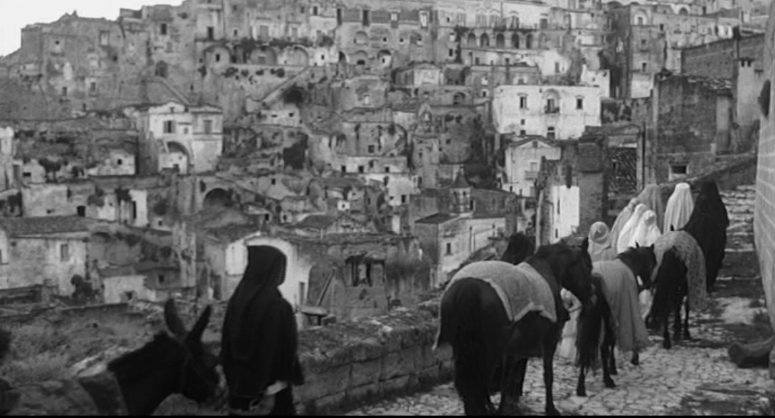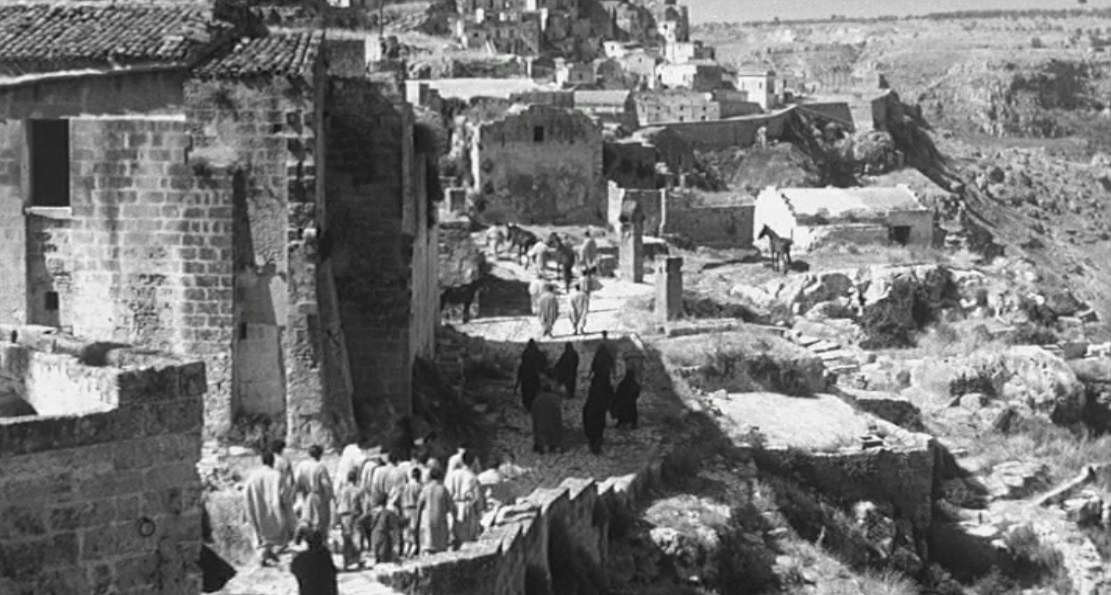 Prendiamo ad esempio la musica. Johan Sebastian Bach compone due Passioni a partire dai testi evangelici di Giovanni e Matteo. Due capolavori datati rispettivamente 1724 e 1727. Pasolini naturalmente utilizza questa musica colta, ma le affianca, a partire dai titoli di testa, brani dalla Misa Luba e dalla Misa Criolla, ovvero i canti del messale (Kyrie, Gloria, Credo, Sanctus, Agnus) eseguiti su sonorità etniche africane e latinoamericane. Il film viene girato mentre è in corso il Concilio Vaticano II (1963-65) che, tra le altre cose, abbandona il latino come lingua liturgica e si apre alle lingue e alle culture locali. Nel 1965, in preparazione del film, Pasolini si reca in Palestina intenzionato a girare negli stessi luoghi teatro dei racconti evangelici, ma capisce che si tratta di un vicolo cieco. Da qui l’intuizione di ambientare la Terra Santa del tempo di Gesù in quella che all’epoca era la Vergogna d’Italia: Matera. La non certo lusinghiera definizione era stata coniata da Palmiro Togliatti, segretario nazionale del Pci, che aveva bollato così la città dei Sassi per le condizioni di vita precarie in cui ancora vivevano i suoi abitanti, in promiscuità con gli animali e senza i servizi essenziali (luce, acqua, fognature…) per una vita civile. Da poco era iniziata una sorta di ‘deportazione forzata’ dalle abitazioni rupestri verso moderni quartieri appositamente costruiti sull’altopiano delle Murge. Opera meritoria e necessaria che non di meno Pasolini utilizza per rimarcare la continuità ideale tra il passato narrato dai Vangeli e la realtà immanente.