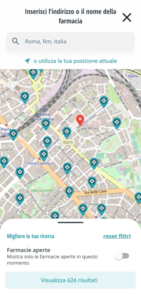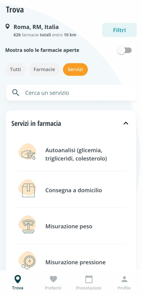 Senza annunci né acquisti, l’App permette di trovare le farmacie nei dintorni attraverso la geolocalizzazione fornendo orari e distanza; utile nel caso si sia in vacanza, ma anche per reperire farmaci necessari in poco tempo. L’App permette di applicare dei filtri nella ricerca ad esempiosi può chiedere che vengano mostrate solo quelle aperte oppure è possibile impostare una distanza massima dalla posizione corrente. Ogni farmacia ha una scheda con indirizzo, numeri di telefono, una mappa che apre l’App di navigazione predefinita per trovare il luogo e gli orari di apertura dei giorni che devono venire; sono presenti anche i prodotti venduti divisi per macrocategorie e i servizi offerti quali misurazione della pressione, prenotazione di visite specialistiche o esami. Viene anche offerta la possibilità inversa, ovvero di filtrare in base al servizio come la consegna a domicilio, la misurazione del peso, elettrocardiogramma e molti altri oppure per la tipologia di prodotti venduti. Infine ,creando un’account, è possibile prenotare il proprio posto per usufruire dei servizi nelle farmacie convenzionate.