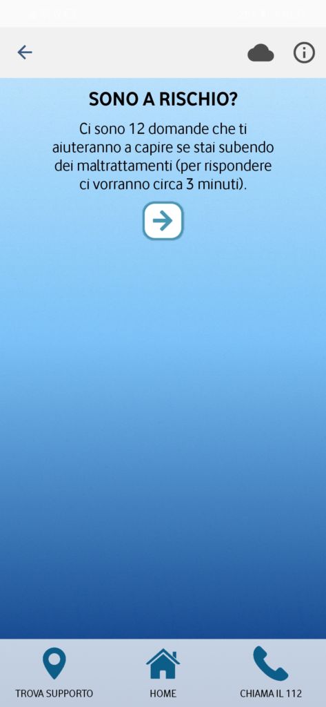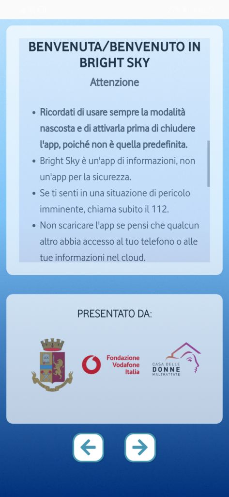 Nella prima schermata è possibile selezionare la lingua e successivamente toccare la freccia che porta nella videata di presentazione; dove si viene informati che l’app fornisce supporto e informazioni a chiunque si trovi in una relazione violenta o sia preoccupato per una persona di sua conoscenza. E’ necessario leggere con molta attenzione tutte le indicazioni presenti nella pagina, qui riportiamo le più significative: