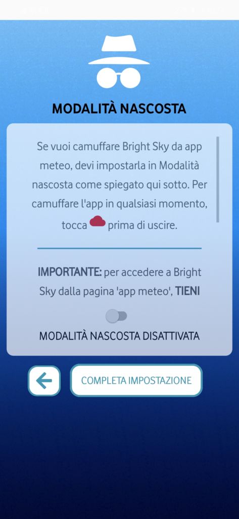 Presentata nella schermata successiva questa modalità quando attiva fornirà informazioni meteo, nascondendo cosi la vera funzione dell’app, infine sarà necessario toccare su modalità nascosta attiva.