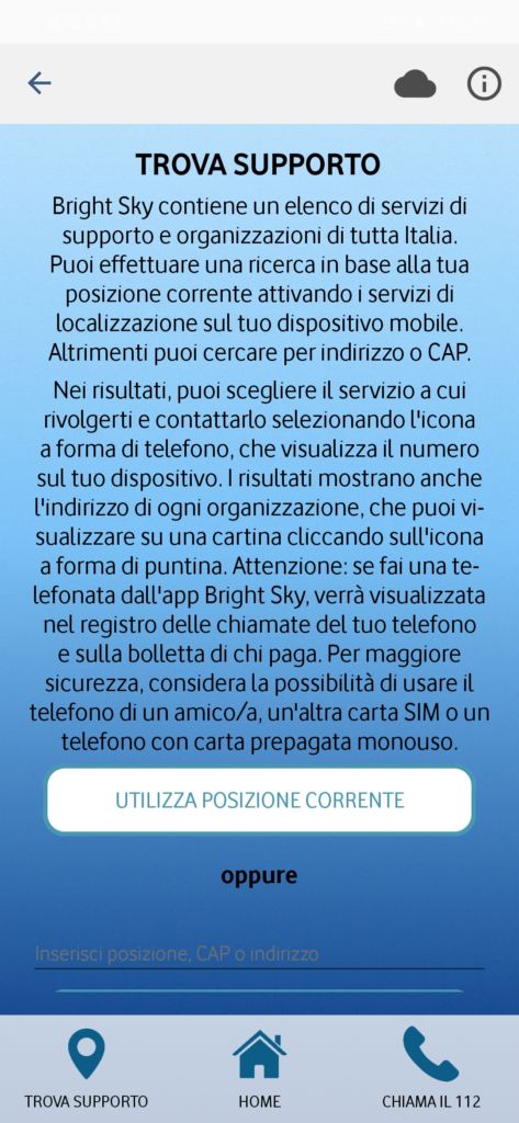 Trova supporto permette tramite geolocalizzazione, quindi con GPS attivo, di trovare servizi di supporto e organizzazioni in tutta Italia; in alternativa è possibile cercare tramite cap o indirizzo. Nella schermata successiva in alto è presente una mappa che geolocalizza i centri antiviolenza, subito a seguire si trovano delle piccole “schede” di presentazione con il nome dell’organizzazione, la distanza dalla posizione attuale, il tipo di attività che viene svolta (ascolto, consulenza legale, orientamento all’autonomia ecc..) e il numero di telefono; anche in questo caso è importante ricordare che tutte le chiamate effettuate sono visibili nel registro chiamate.