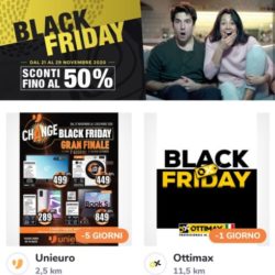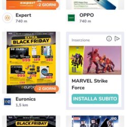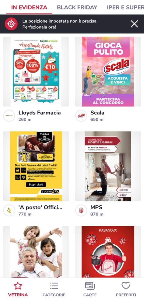 Nell’app è presente anche una barra in basso con le seguenti voci: vetrina che riporta l’utente alla home, categorie con dei grandi pulsanti permette di filtrare una categoria, carte che propone di scaricare un’app esterna per memorizzare le carte fedeltà e infine preferiti di cui tratteremo più avanti.