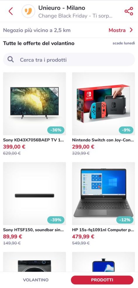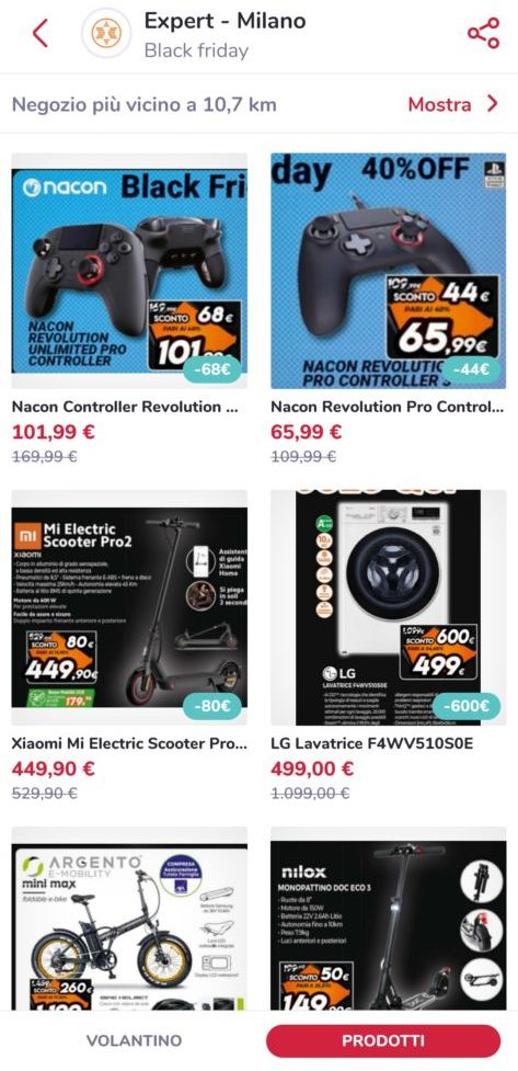I volantini si possono visionare in due modi differenti, come si può vedere dalle immagini in fondo alla pagina. Il primo come se fosse un volantino cartaceo, quindi è possibile sfogliare il volantino e avere maggiori informazioni sul prodotto toccando sul simbolo “+”, in questo modo si aprirà la scheda prodotto. In altri casi i prodotti vengono presentati in sequenza dentro grandi icone e sarà possibile scorrere la pagina; anche in questo caso toccando su un prodotto si aprirà la relativa scheda. Dalle schede prodotto è possibile andare alla relativa pagina del sito toccando su scopri di più o aggiungere il prodotto ai preferiti toccando sul pulsante relativo. Nel caso dei volantini sfogliabili sarà possibile salvare una pagina nei preferiti toccando sul pulsante contenente una forbice. Di seguito si riportano delle precisazioni: alcuni volantini sono visionabili in entrambi i modi sopra descritti, alcuni solo in uno dei due; non è sempre possibile visionare una scheda prodotto, ad esempio non vi sono sempre schede prodotto su prodotti alimentari.