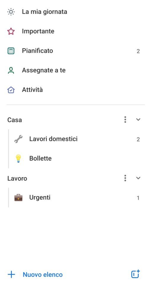 Nella parte bassa dello schermo a sinistra si trova la voce “nuovo elenco” e a destra un’icona che permette di creare nuovi gruppi. Un elenco è un insieme di attività e un gruppo è un insieme di elenchi. Per capire meglio questo concetto prendiamo in considerazione un piccolo esempio. Immaginando che si rompa il lavandino, si crea un’attività chiamata ‘riparare lavandino’; vi sono anche altre attività riguardanti la cura della casa quindi si crea un elenco chiamato ‘lavori domestici’ a cui si aggiungeranno le varie attività. C’è poi la necessità di ricordarsi di pagare le bollette quindi si possono creare diverse attività, una per ogni bolletta e le si aggiunge a un elenco ‘bollette’; ora vi sono due elenchi ‘lavori domestici’ e ‘bollette’ legati entrambi all’ambiente della casa, quindi si crea un gruppo chiamato ‘casa’ in cui si aggregano i due elenchi; il risultato è visibile in una delle immagini sotto riportate.