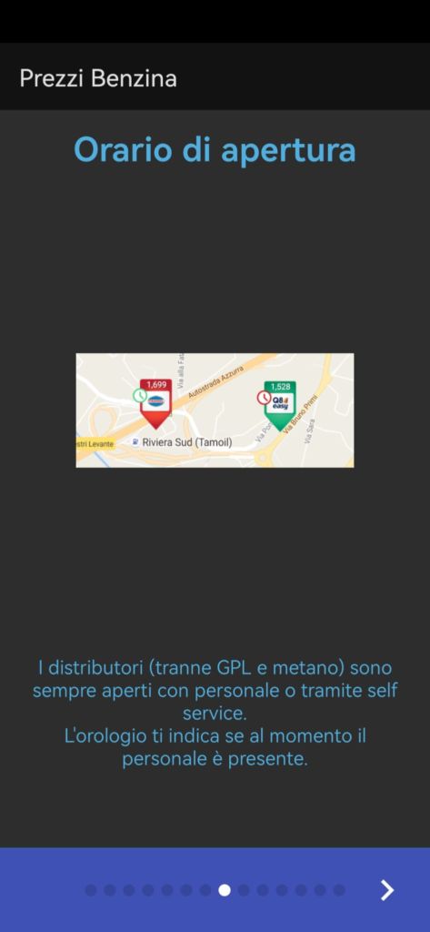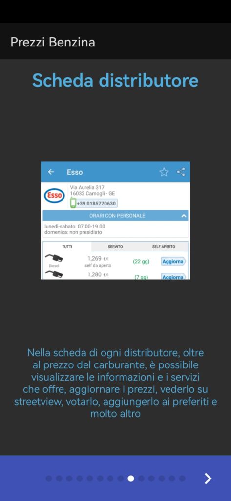 In ogni scheda quando si tocca sul distributore viene aperta una scheda in cui si trovano il numero di telefono, orari con il personale, i servizi offerti (autolavaggio, tabaccheria, bar), le modalità di pagamento, i prezzi della benzina con il tempo in giorni dall’ultimo aggiornamento e i voti degli altri utenti.