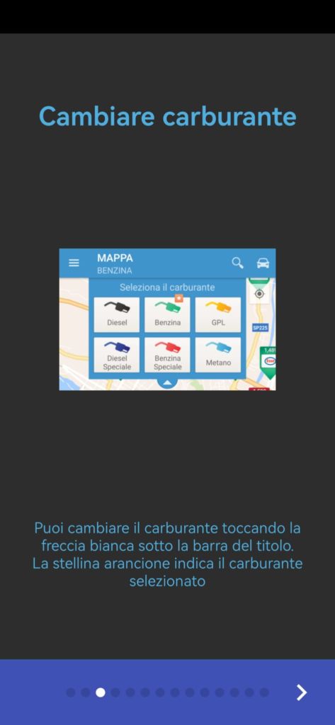 Da tutte le schede è possibile toccando sulla freccia sotto la barra in alto cambiare il tipo di carburante.