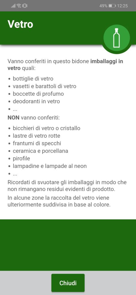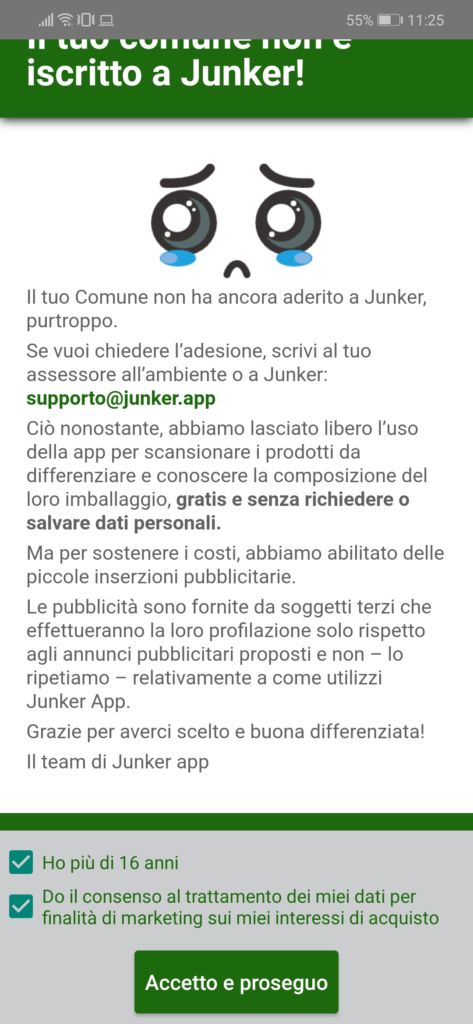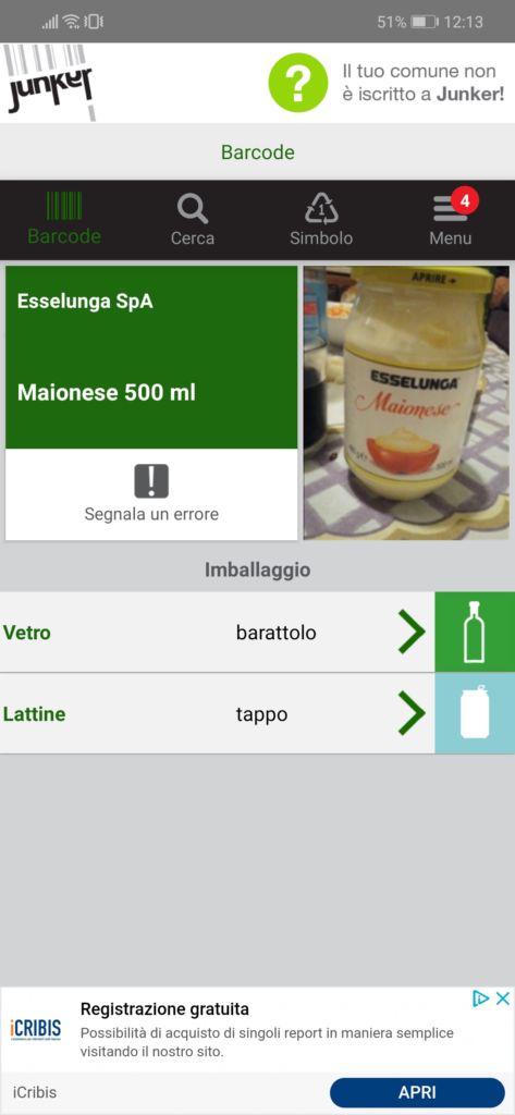 Abbiamo provato a scansionare diversi prodotti e siamo rimasti molto contenti della velocità con la quale un prodotto viene riconosciuto. La pubblicità, che si trova nella parte bassa della pagina, non è invasiva. Abbiamo trovato molto interessante la funzione simbolo, veramente completa ed esaustiva nelle spiegazioni. La maggior parte dei prodotti che abbiamo scansionato erano presenti nel database, quindi c’è stato semplicemente indicato dove buttare le varie parti del contenitore. Nel caso in cui un prodotto non sia presente nel db, viene richiesto di inviare una foto della confezione e di suggerire i materiali che compongono l’imballaggio. Non essendo il nostro Comune convenzionato con Junker, a volte ci è stato suggerito di smaltire plastica e alluminio in contenitori diversi; in casi come questo è necessario fare riferimento alle istruzioni date dagli enti locali che si occupano dello smaltimento.