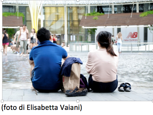 ponete sempre il telefono dal vostro punto di vista (altezza occhi), questo non vuol dire che non dobbiate abbassarvi per scattare una fotografia! Come si può osservare in questa fotografia, io mi sono avvicinata ai soggetti ritratti per catturarli durante una loro breve pausa ai piedi della fontana in Piazza Gae Aulenti a Milano;- cercare soggetti interessanti, ma meglio evitare i bambini e gli adolescenti;
