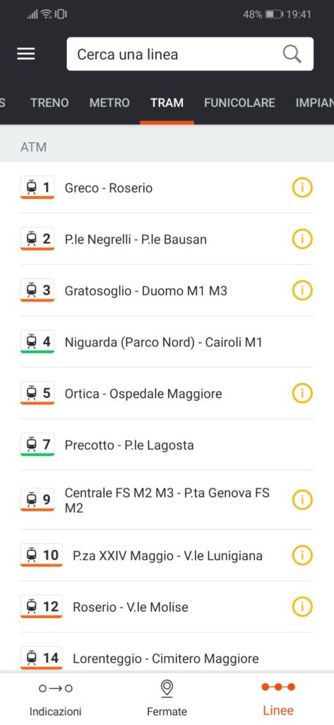 La funzione fermata permette di vedere le fermate di tutti i mezzi nelle zone vicine collocate su un mappa che ne indica la posizione. Cliccando su una fermata saranno visualizzati i dettagli: Nome della fermata, gli orari delle prossime due corse; cliccando ancora una volta sulla fermata verrà aperta una schermata nella quale si trovano tutte le fermate precedenti e successive a quella scelta; infine cliccando su tutti gli orari sarà disponibile la tabella con tutte le corse previste e ovviamente sarà riportato anche l’orario. Linee da la possibilità di visionare le stesse informazioni disponibili nella sezione fermate ma raggruppa e permette di cercare i mezzi con il numero della linea.