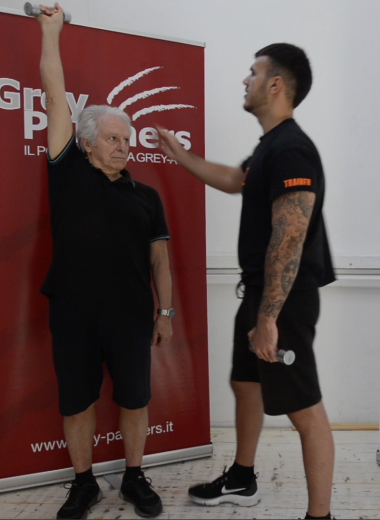 I muscoli posteriori vengono detti muscoli estensori dell’avambraccio e sono quelli che, con l’esercizio proposto oggi dal trainer, attiveremo con l’aiuto anche del manubrio da 1 kg.