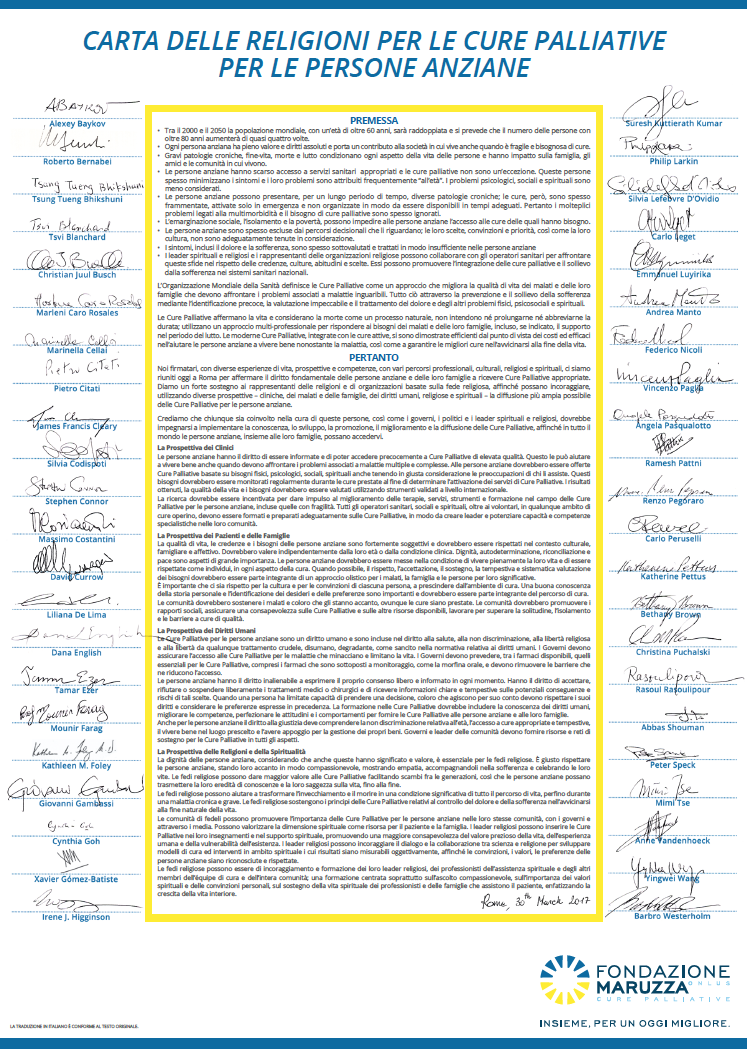 Il 30 marzo 2017 La Fondazione Maruzza ha riunito a Roma all’Accademia Pontificia per la Vita (Città del Vaticano), rappresentanti delle maggiori Religioni, attivisti dei diritti umani, medici, pazienti e familiari per redigere e firmare la “Carta delle Religioni per le Cure Palliative per le persone anziane”: un documento di valore globale.