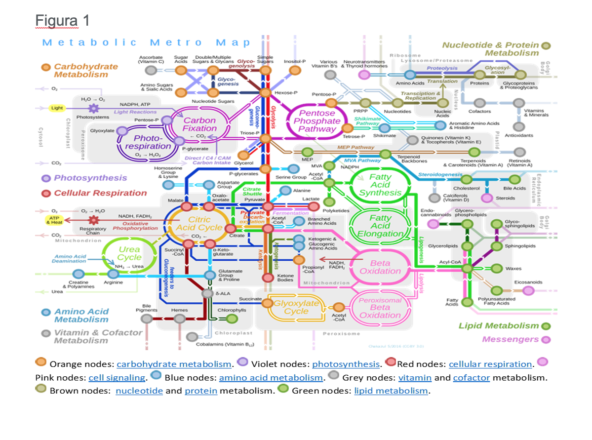 La figura 1 riporta una configurazione stilizzata del Metabolismo rappresentata come una mappa di un metrò dove ogni punto è una molecola originata da una specifica reazione e le linee rimparentano le vie metaboliche.