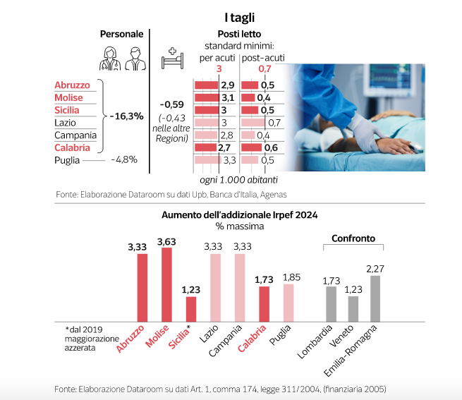 Infine per le Regioni in Piano di rientro c’è la perdita della quota premiale, ovvero quella parte del finanziamento del Servizio sanitario nazionale che viene attribuita solo a chi raggiunge determinati obiettivi di qualità ed efficienza. Per il 2024 questa quota vale 670 milioni di euro, pari allo 0,5% del livello complessivo di finanziamento (qui). Le Regioni che non raggiungono gli standard richiesti non la incassano, con un impatto diretto sulla disponibilità di risorse per la sanità. Ma oltre al danno c’è pure la beffa. I Piani di rientro prevedono un aumento automatico della pressione fiscale regionale, proprio per contribuire al risanamento dei conti. In particolare, si stabilisce l’incremento di 0,15 punti percentuali sull’Irap (l’imposta regionale sulle attività produttive) e di 0,30 punti sull’addizionale regionale Irpef, rispetto ai livelli base (qui legge 311/2004, Finanziaria 2005, art. 1, comma 174 e qui legge 23 dicembre 2009, n. 191, articolo 2, comma 86). Questo significa, per esempio, che in Lombardia, per un reddito inferiore ai 15 mila euro, l’addizionale Irpef è dell’1,23%, mentre in Calabria sale all’1,73%. In pratica, chi vive in Regioni con una sanità in difficoltà si trova a pagare di più in tasse locali, pur avendo accesso a servizi sanitari meno efficienti, con minori prestazioni disponibili e standard assistenziali inferiori. Un paradosso che accentua ulteriormente le disuguaglianze territoriali e sociali (Lazio, Calabria, Campania e Molise qui; Puglia; in Sicilia la maggiorazione viene azzerata dal 2019 qui; mentre in Abruzzo proprio per coprire la voragine dei conti della sanità è scattato un nuovo aumento il 4 aprile 2025 qui).