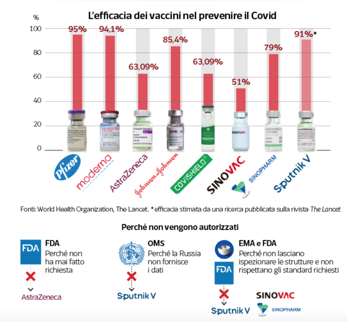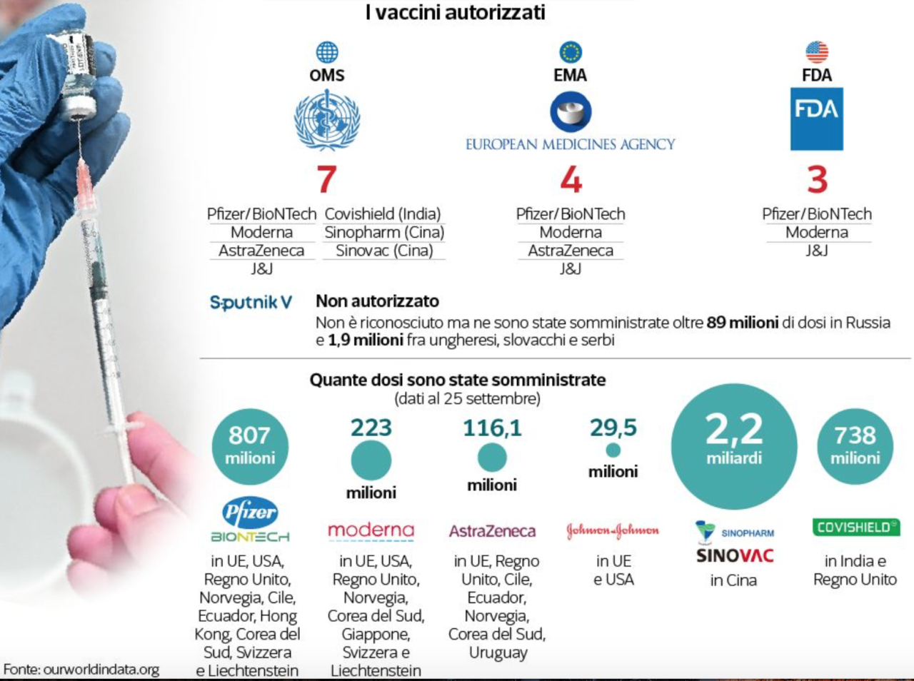 L’Agenzia europea per i medicinali (Ema) non riconosce i vaccini cinesi (2,2 miliardi di dosi somministrate in Asia, decine di milioni in Sudamerica, 2,1 milioni in Ungheria), e quello indiano (oltre 733 milioni di dosi fatte in India e 5 milioni in Gran Bretagna). Le ragioni sono dovute alle informazioni insufficienti e, nel caso della Cina, anche all’impossibilità di ispezionare i luoghi di produzione. L’Agenzia per i medicinali statunitense (Fda) riconosce solo i suoi 3 (Pfizer, Moderna, J&J) e non AstraZeneca perché la multinazionale inglese non ha mai fatto richiesta. E poi c’è il vaccino russo Sputnik: 89 milioni di dosi somministrate in Russia e 1,9 milioni fra ungheresi, slovacchi e serbi. Nel mondo 54 Paesi ne hanno ordinate 448 milioni, ma non è approvato da nessuna delle tre autorità sanitarie internazionali perché non è in grado di produrre la documentazione richiesta dagli enti regolatori e dall’Oms.